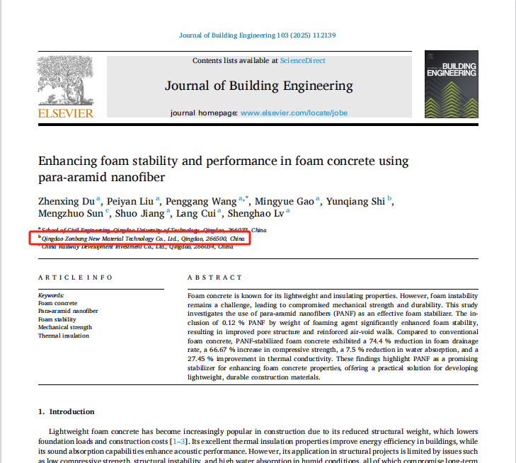 近日,青島中邦新材料科技有限公司聯(lián)合青島理工大學(xué)在材料科學(xué)研究領(lǐng)域取得重大突破,關(guān)于納米發(fā)泡混凝土技術(shù)的論文成功發(fā)表于國際知名期刊《Journal of Building Engineering》。這一成果標(biāo)志著公司在納米發(fā)泡劑領(lǐng)域的研究達到了國際領(lǐng)先水平。