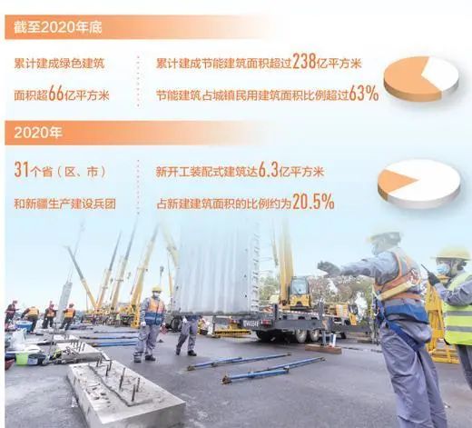 相比傳統現澆方式,裝配式建造不僅速度快,還能有效降低施工過程中的建筑垃圾排放,并且能減少揚塵和噪聲等環境污染。數據顯示,2020年,31個省(區、市)和新疆生產建設兵團新開工裝配式建筑達6.3億平方米,較2019年增長50%,占新建建筑面積的比例約為20.5%。